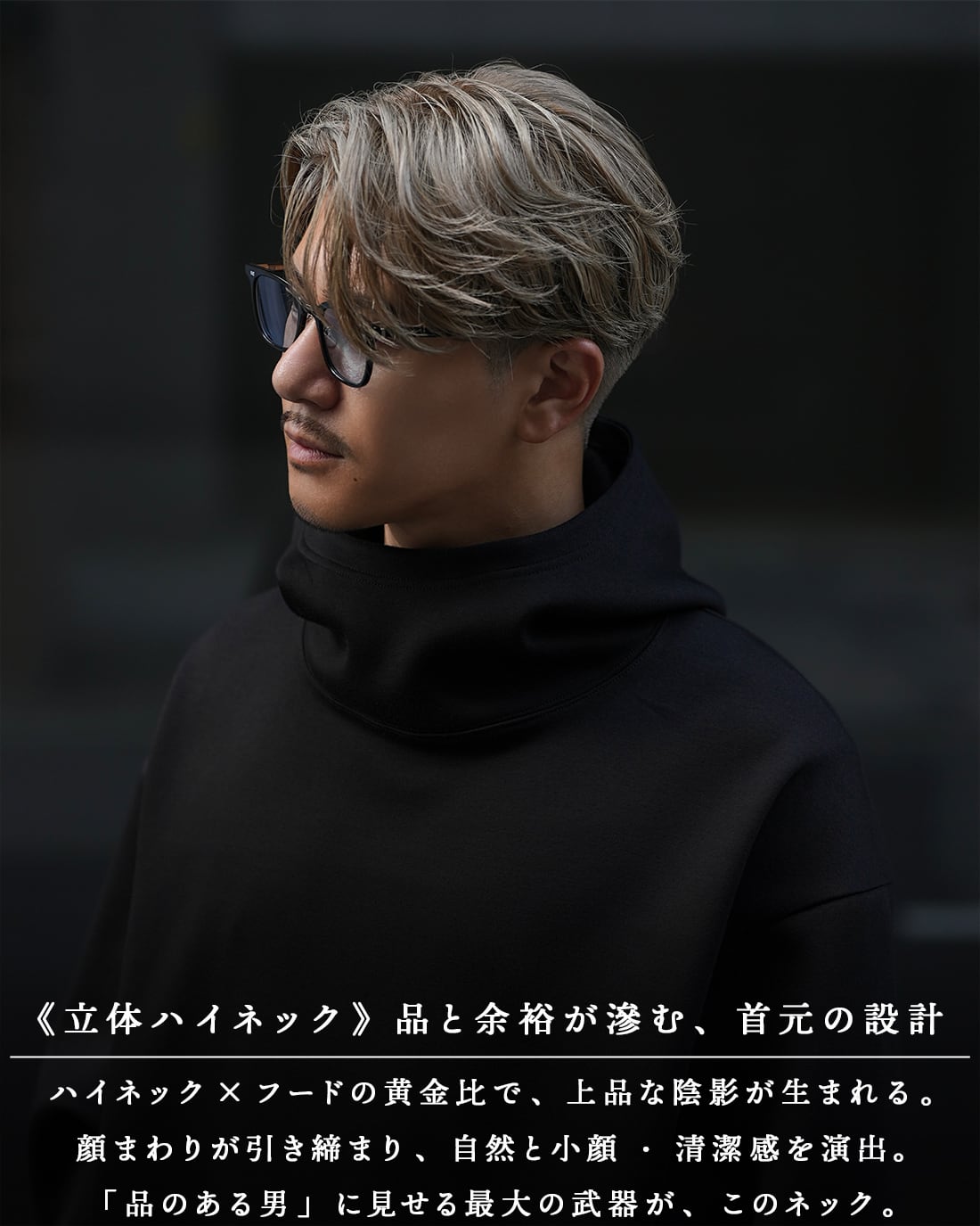 ハイネック仕様と、立体的なフードの立ち上がり設計は格別に美しいシルエット。