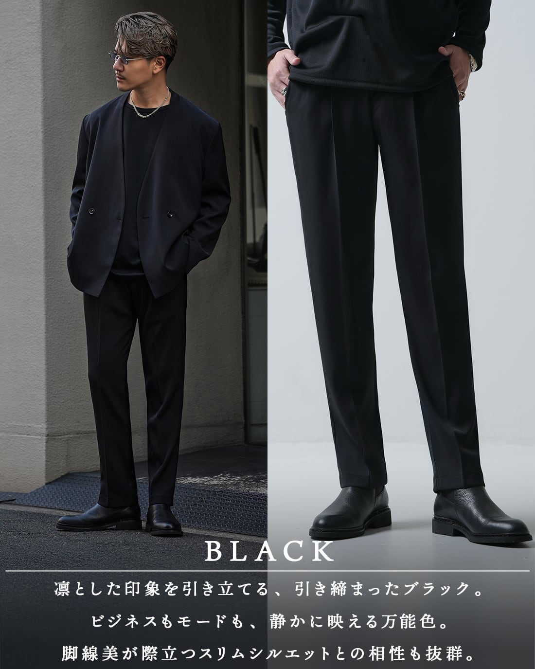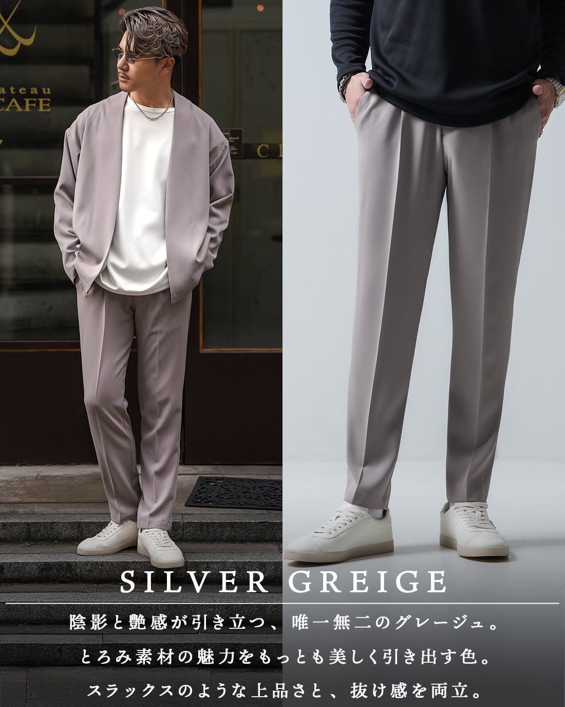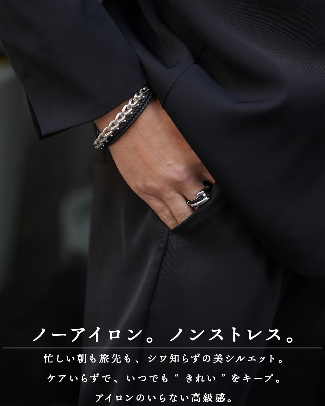 SUAVELEオリジナルの極TOROMI素材が動きに合わせてしなやかに揺れ、スリムパンツ特有の“突っ張り感”を感じさせない極上の大人シルエット。