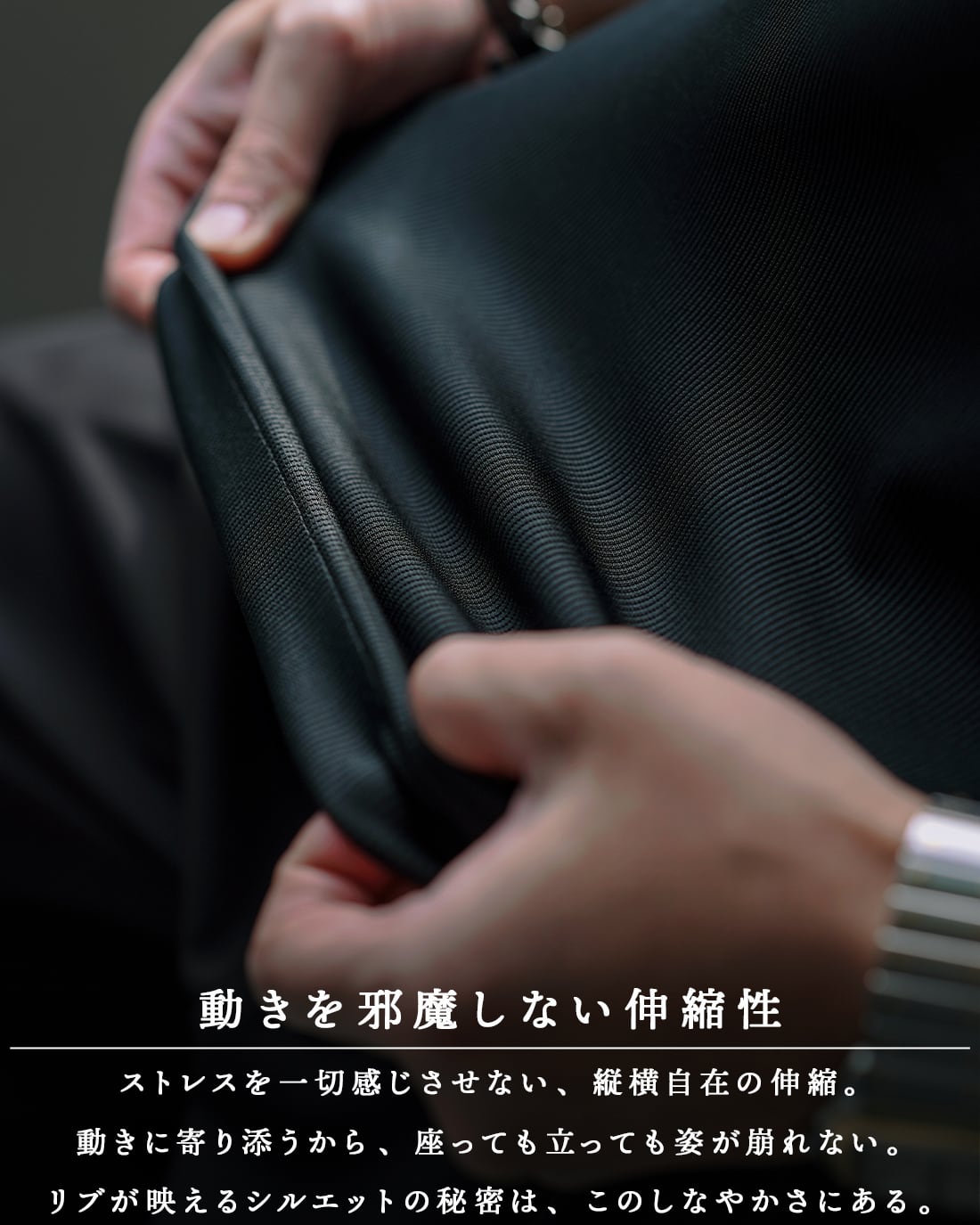 リブの伸縮性を活かし、締め付けすぎず自然なフィット感。